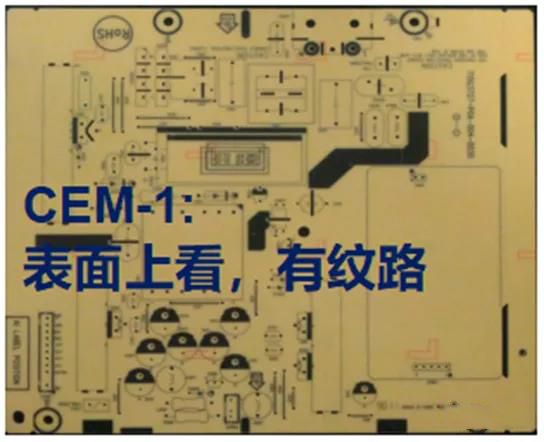 a、組成特征:基材由紙質(zhì)碎沫和環(huán)氧樹脂混合,表層是玻璃纖維,壓合而成,表面上看,有紋路.