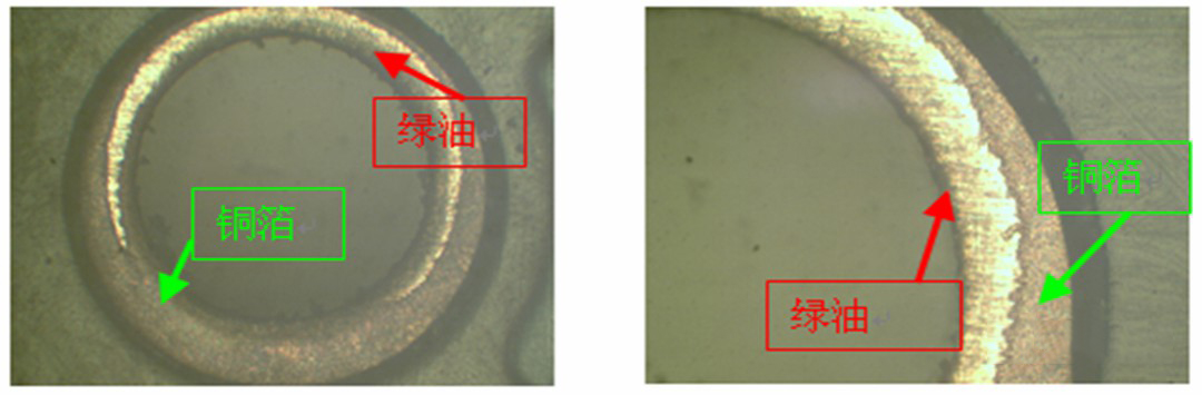 2、原因分析:6月17號(hào)因曝光房空調(diào)故障,室內(nèi)溫度比較高,溫度高達(dá)28.7℃(標(biāo)準(zhǔn)濕度:22±5℃,平時(shí)一般控制在20-24℃左右),在印刷時(shí)孔口處油墨相對(duì)較?。ㄒ蚩卓谂c孔壁會(huì)形成角度,所以在印刷時(shí)拐角處油墨會(huì)相對(duì)較薄且會(huì)滲透至孔口),故在預(yù)烤OK后將板放置在曝光房待生產(chǎn)時(shí)時(shí)間過長(zhǎng),沒有管制放置時(shí)間,因室內(nèi)溫度較高,導(dǎo)致焊環(huán)邊上的油墨會(huì)烤死固化,最終在顯影時(shí)有一層薄薄的綠油殘留在焊環(huán)上不易顯影掉,形成孔口有綠油,進(jìn)而造成波峰焊不爬錫